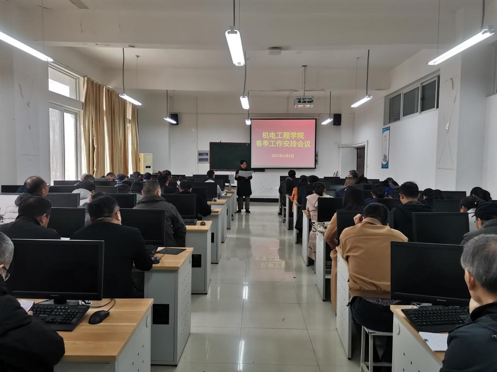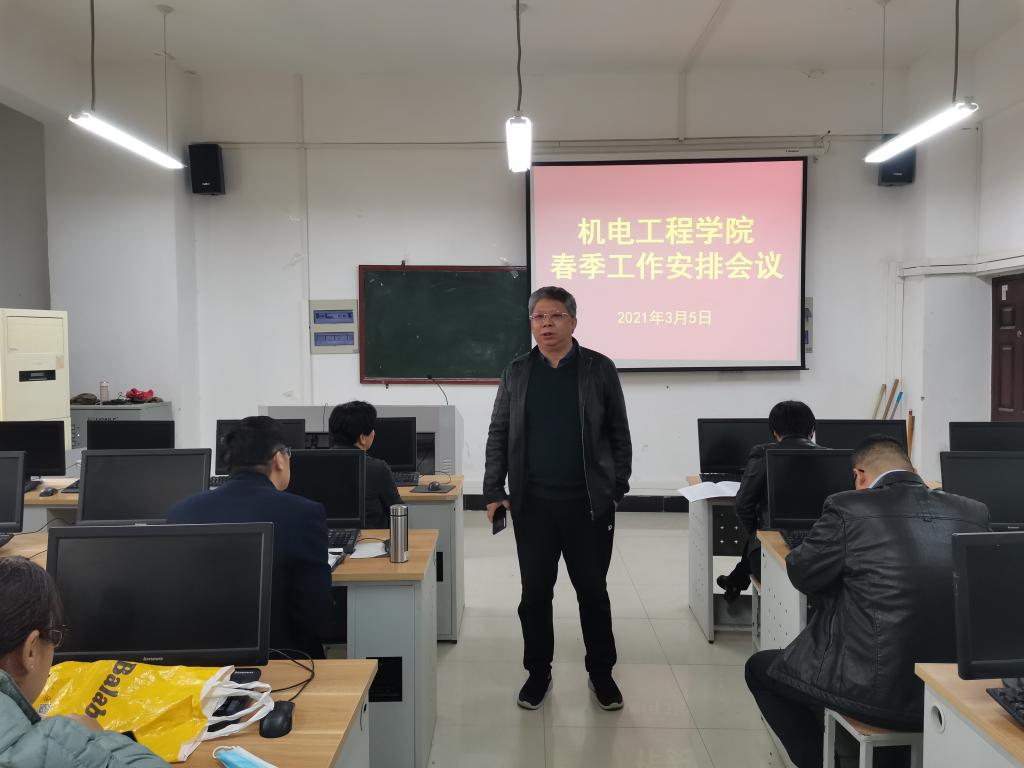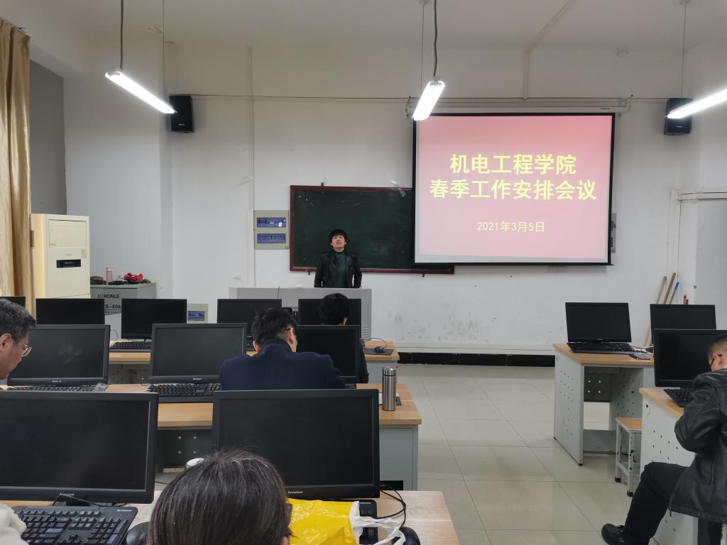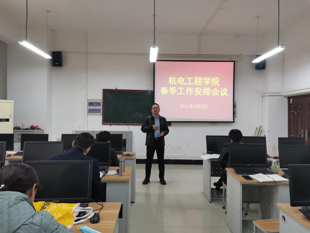 2021年3月5日上午10点,机电工程学院在笃行楼220室召开了2021年春季工作会议,总结2020年度工作,部署2021年度工作。机电工程学院领导班子成员、全体教职工参加了会议,学院党总支书记袁世先主持会议并讲话。