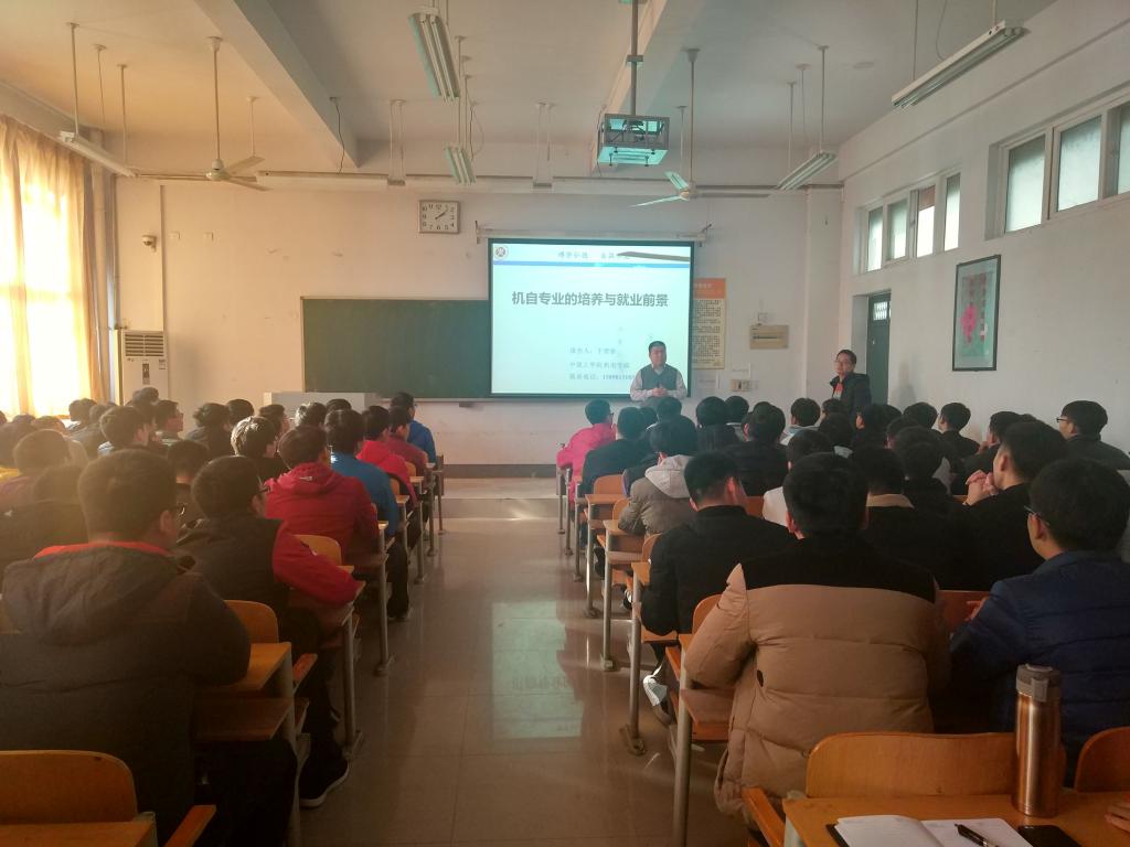 11月30日下午,机电工程系本科机自专业有幸邀请到中原工学院机自系主任于贺春博士,做了题为“机自专业培养与就业前景”的专题讲座。旨在通过讲座提升学生对于专业的整体认识,机自专业三个年级本科生共120余人聆听了讲座。