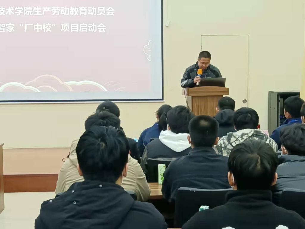 赵军华书记在致辞中指出,河南职业技术学院生产劳动教育课“厂中校”项目是我校生产劳动教育模式的新探索,是职业教育和劳动育人相结合的新模式。其目的是以劳树德、以劳增智、以劳强体、以劳育美;通过产教融合、校企合作等途径,让学生参与企业生产劳动,增强职业荣誉感,提高职业技能水平;弘扬劳模精神、劳动精神和工匠精神;引导学生创造性地解决实际问题,积累职业经验。赵书记希望各位学生遵守企业安全制度,注重创新创业能力培养,积极进取,不负韶华,在劳动教育中提高自己。