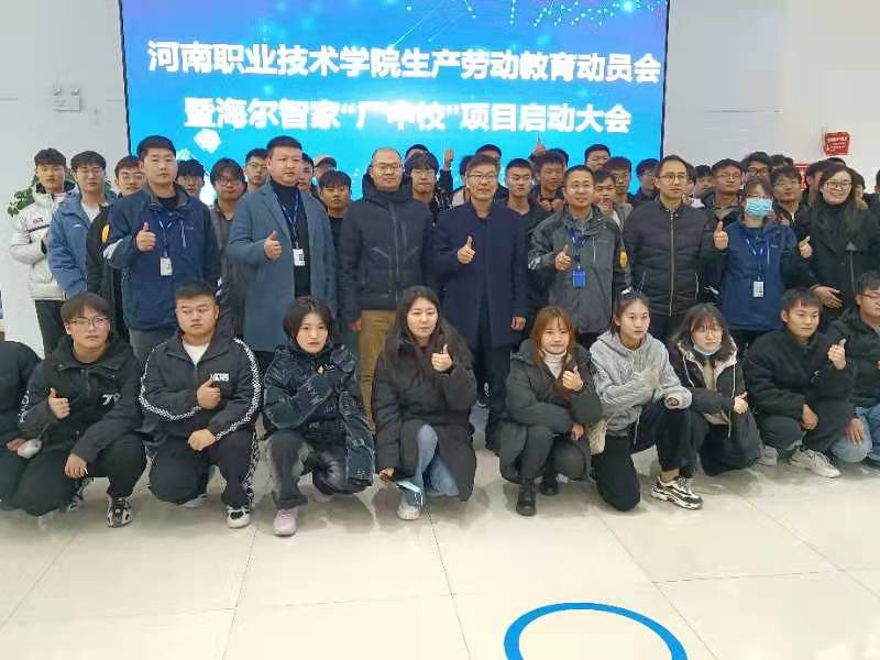 12月23日,我院和郑州海尔园区合作“厂中校”项目“河南职业技术学院生产劳动教育课”开班仪式在海尔园区举行。我院党总支书记赵军华、副书记张俊叶、副院长冯金广和海尔园区部长付乐乐,人力主管高毅等出席开班仪式并致欢迎辞。智能智造学院46位优秀学生班干作为首批学员入企参加劳动学习。