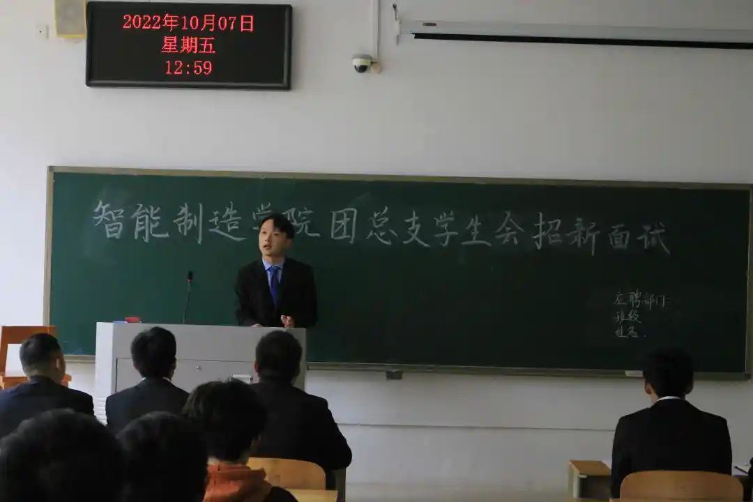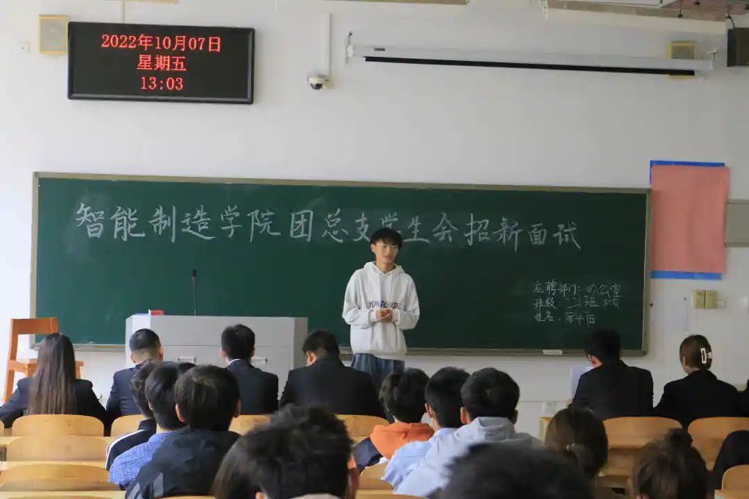 2022年10月7日智能制造学院学生会招新面试工作在1206、1207教室举行,参加本次面试人员128人,全体学生会干部作为部门评委参加。
