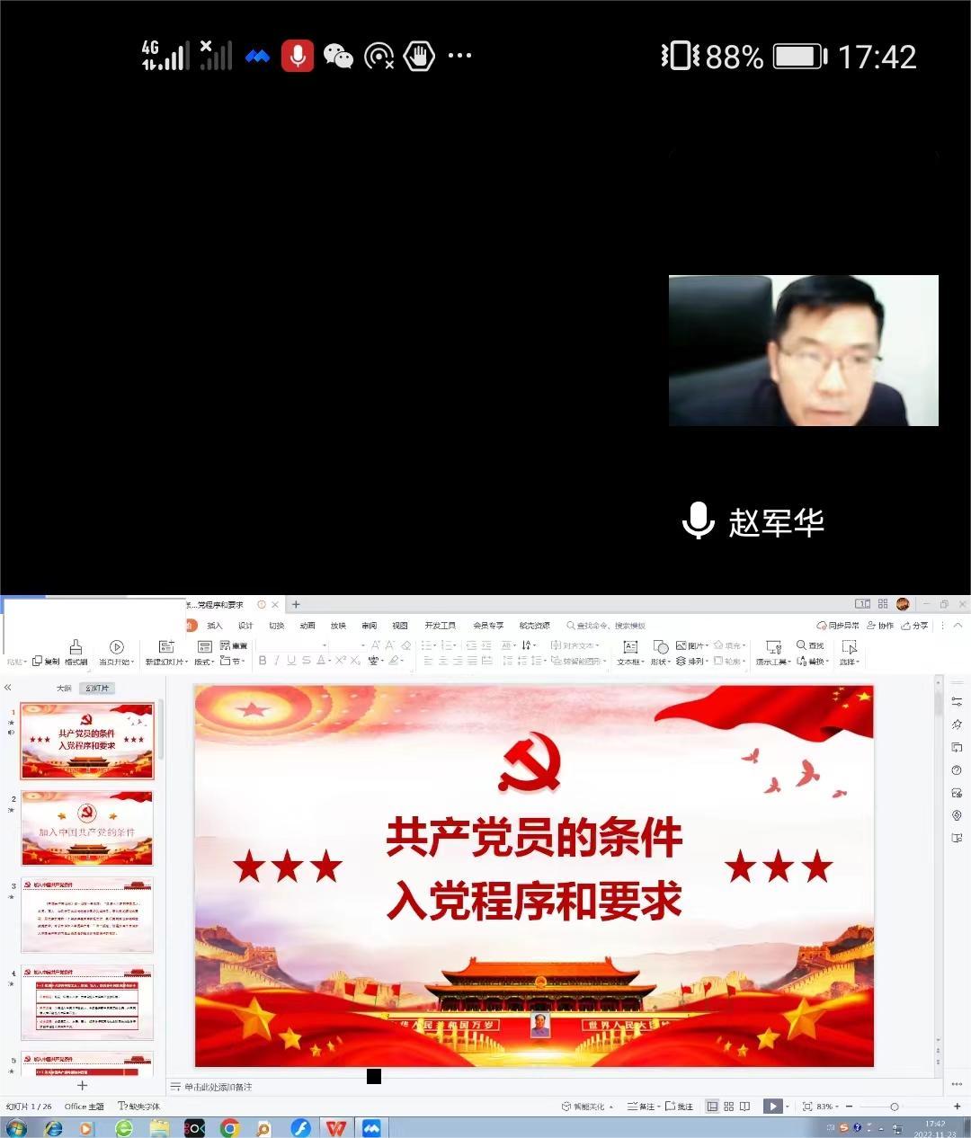 11月23日,智能制造学院党总支书记赵军华同志为入党积极分子开展主题为《加入共产党的条件、入党程序和要求》的专题讲座,此次讲座通过腾讯会议直播的方式进行。