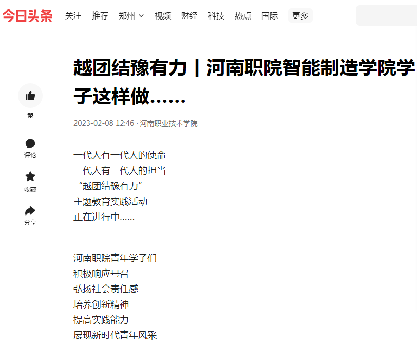 智能制造学院团总支贯彻落实活动要求,组织全体学生积极参加相关活动,成效显著,反响热烈,被人民日报、河南日报、今日头条、新浪微博、澎湃客户端、校视频号等多家媒体关注和报道。