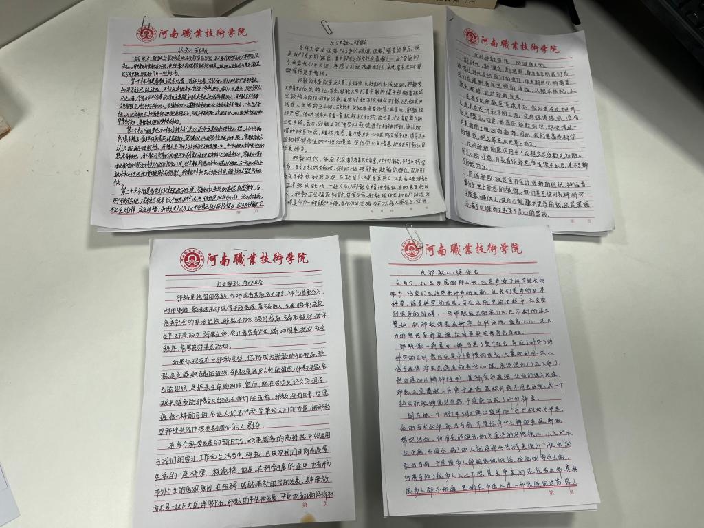 为了进一步提高和加强大学生反邪教“四课”教育,以切实提升新生识邪、辨邪、拒邪、防邪的意识和能力。3月29日-4月3日期间,智能制造学院反邪教协会对学生学习《大学生第一课--认知邪教》心得体会进行了评选和展示。《大学生第一课--认知邪教》教育读本详细介绍了邪教的本质、特征、邪教的社会危害和邪教常用的骗人手法等,能够帮助新生认识邪教,增强辨别邪教的能力,自觉防范和抵制邪教侵害。