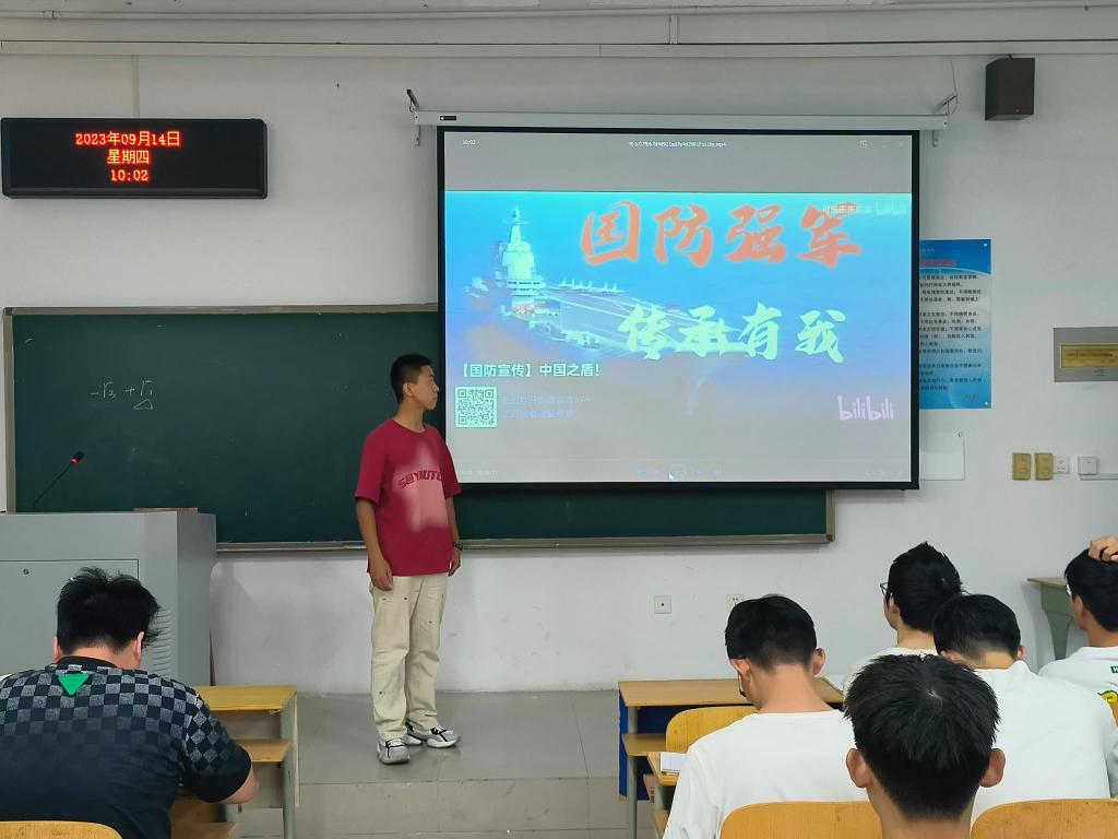 班会中,辅导员首先播放了《国防强军 传承有我》的教育宣传片,接着带领同学们学习了国防教育的定义、国防教育的目的及其重要性、我国在国防方面取得的成就及主要国防力量。在征兵政策宣传环节中,辅导员带领班级学生集体学习了大学生参军入伍明白卡,从征兵入伍条件要求、应征入伍基本流程、退役士兵的优惠政策等。