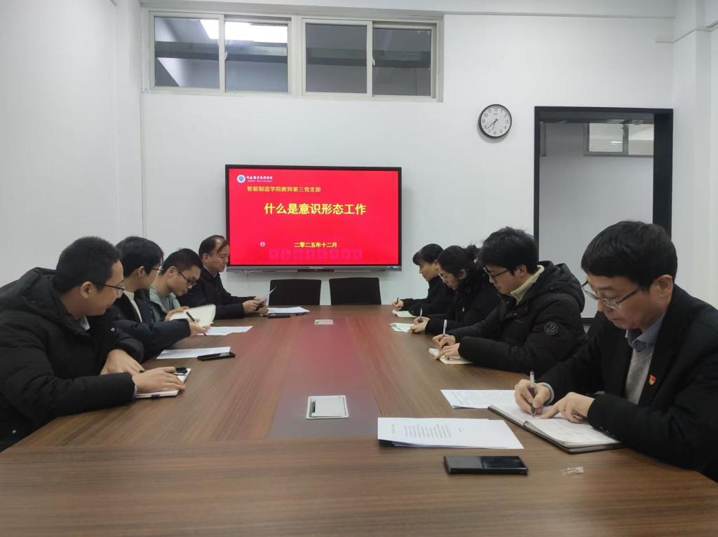 12月29日晚,智能制造学院教师第三党支部在302东会议室召开专题学习会,支部全体党员教师参会,围绕党风廉政建设、意识形态工作、专创融合等核心议题开展集中学习与深入研讨,切实推动党建与专业建设深度融合。