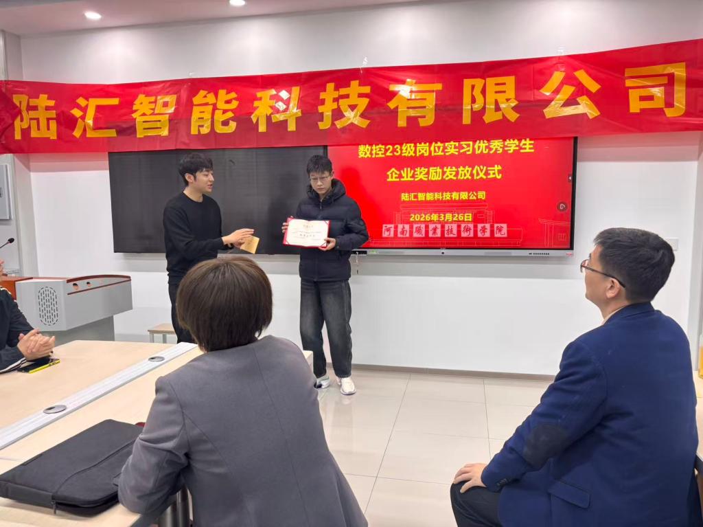 岗位实习是深化校企协同育人、衔接校园与职场的重要纽带,是提升学生专业技能、锤炼实践本领的关键环节。为表彰岗位实习中的优秀学子,发挥榜样示范引领作用,进一步深化校企合作、拓宽协同育人路径,3月26日,智能制造学院在智行楼210隆重举行岗位实习优秀学生颁奖仪式。陆汇智能科技有限公司人力资源总监程巍一行专程莅临参会,学院班子成员及相关教师代表出席仪式,数控技术专业学生代表参加活动。仪式由数控专业教研室主任楚雪平主持。